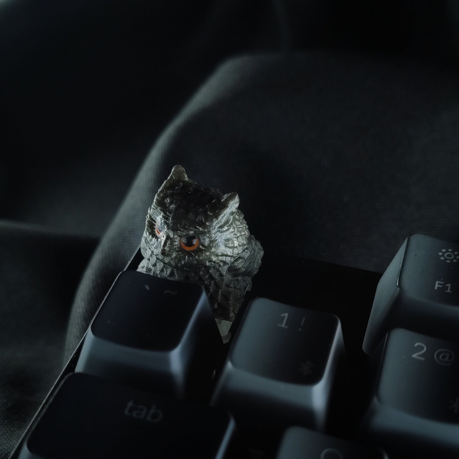 回転する頭を持つフクロウ。エポキシ樹脂職人のキーキャップ