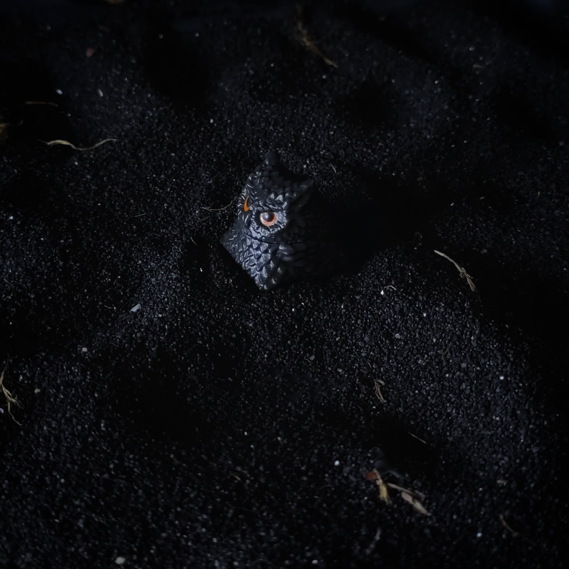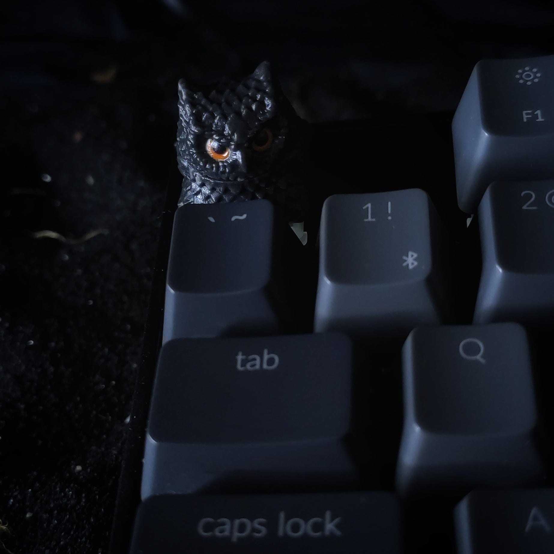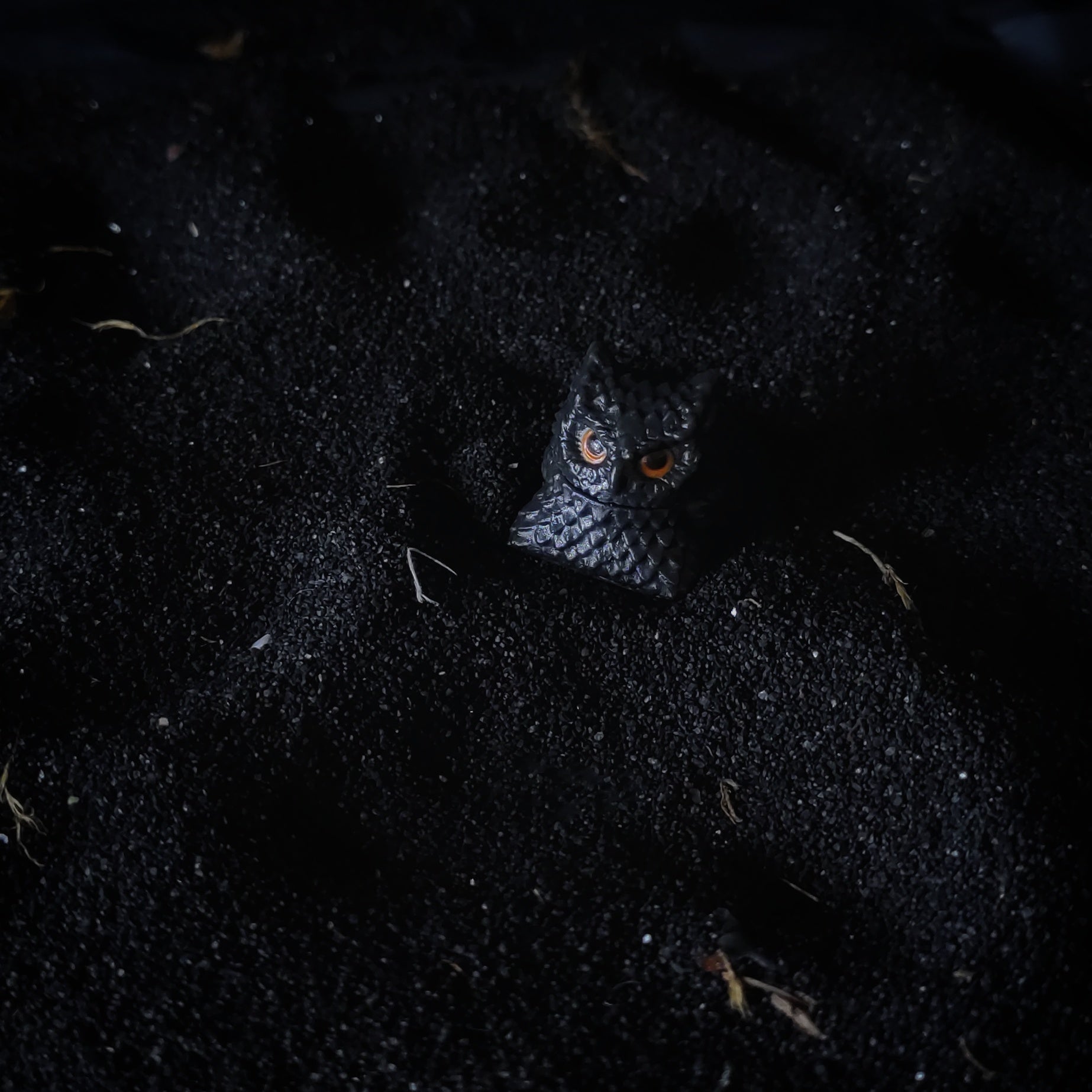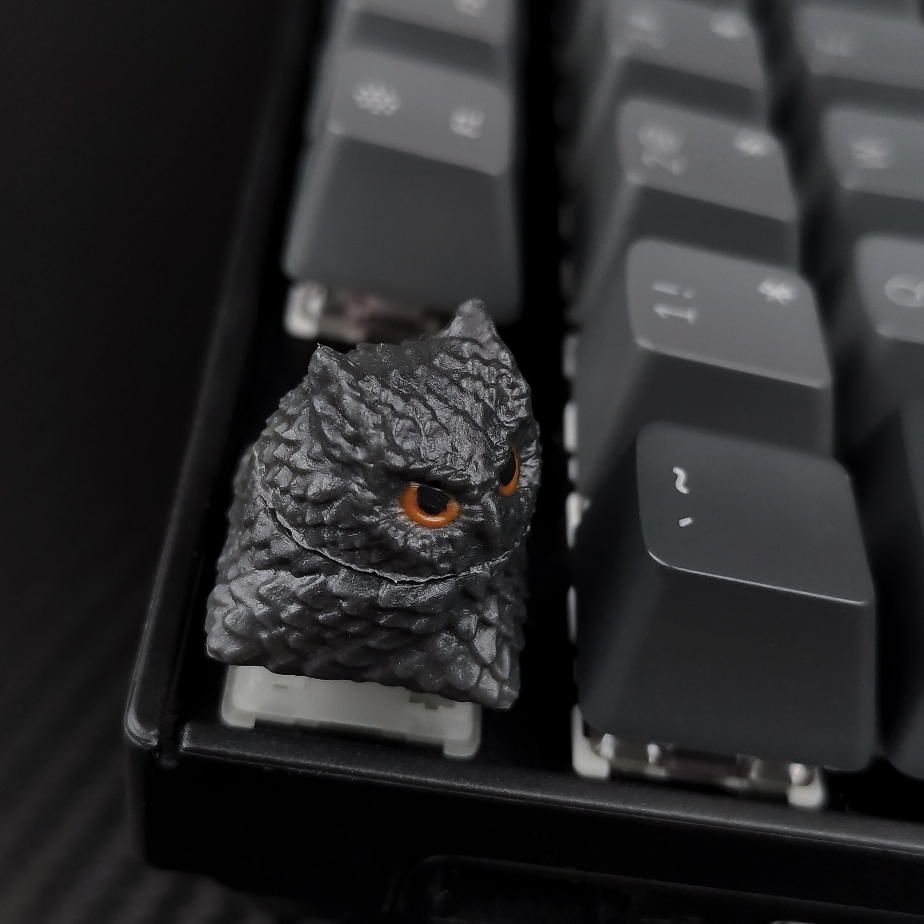 回転する頭を持つフクロウ。エポキシ樹脂職人のキーキャップ